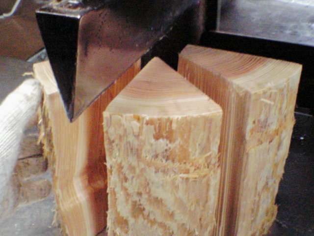 | 手割り 皮を剥ぎ玉切りした丸太を木目通りにミカンの切り口状に細かく割ります。木材は成長する際、日当たりを求めて左右に旋廻(捻れ)しながら根を張り大きくなります。割箸にして真直ぐ割れるように熟練工員が木目を確認しながら、手作業で割ります。 |