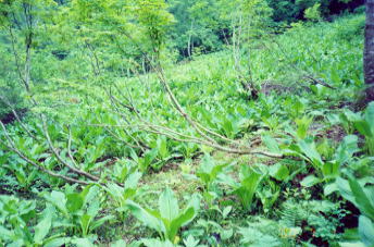 そこを過ぎると水芭蕉の群生地を通るのだが、もうみんなお化けの様に大きな葉っぱに成長